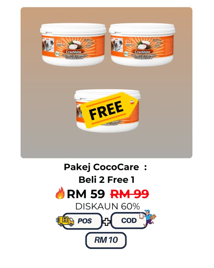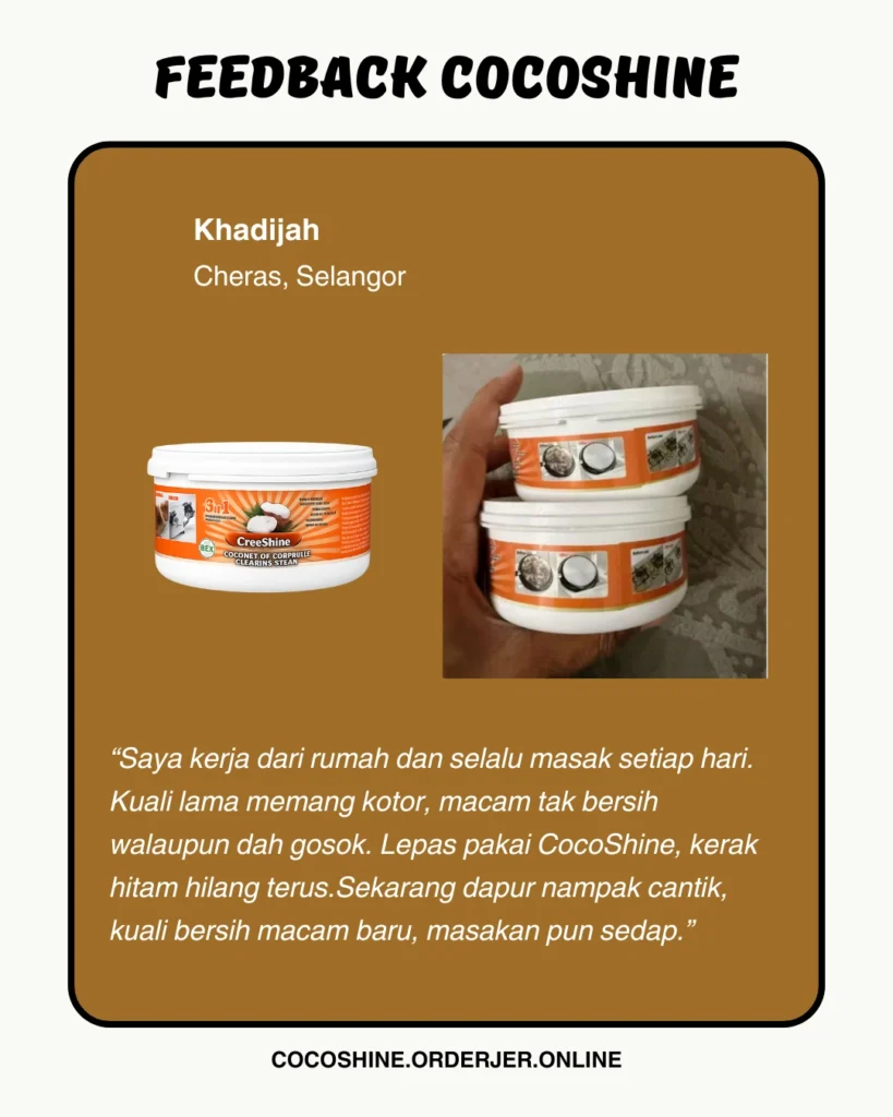 CocoShine hilangkan kerak hitam degil tanpa perlu gosok kuat.